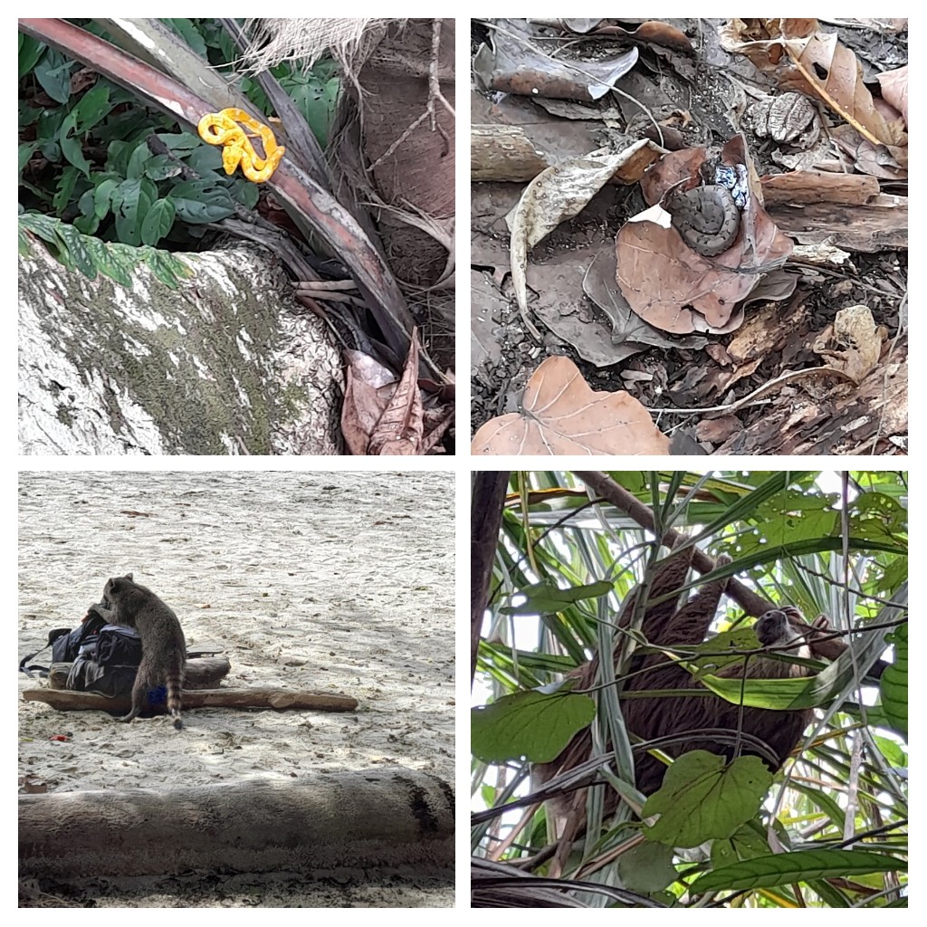 Etwas weiter nördlich in Cahuita gibt es einen kommunalen Nationalpark auf Spendenbasis. Viele neue Tiere habe ich dort nicht entdeckt (hab schon zu viele gesehen 😉) außer einer kleinen Giftschlange, aber die Wege sind ganz nett und man teilweise hüfthoch durchs Wasser waten. Es empfiehlt sich also, Badesachen zu tragen.