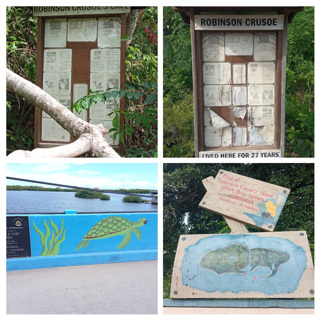 Einige Schilder behaupten, es handle sich bei Utila um die Insel, auf der Robinson Crusoe 27 Jahre lang gelebt hat. Von Höhle, über Strände bis hin zu Oase kann man die Orte des Romans besuchen. Wie gesagt, handelt sich bei Robinson Crusoe allerdings um eine Romanfigur, die nicht wirklich existiert hat. Sicher gab es Schiffbrüchige, die als Vorlage für den Roman gedient haben, aber sicher nicht mit diesem Namen und wahrscheinlich keine 27 Jahre. Am wahrscheinlichsten diente Alexander Selkirk, der vor der Küste Chiles ausgesetzt wurde, als Vorlage. Utila spricht allerdings explizit von Robinson Crusoe und nicht irgendeinem Schiffbrüchigen, also einfach eine Tourismusidee, die so wie die Schilder aussehen, aber aktuell nicht wirklich verfolgt wird, sicher auch aufgrund der Pandemie.