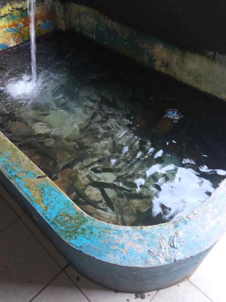 Das Abendessen war toll. Es gab im Restaurant einen Teich mit Fischen. Man hält die Angel hinein und der Fisch, der angebissen hat, wird zubereitet. Ich hätte allerdings vielleicht erst zurückfahren sollen, denn als ich das Restaurant verlasse, sehe ich die Autos stehen.