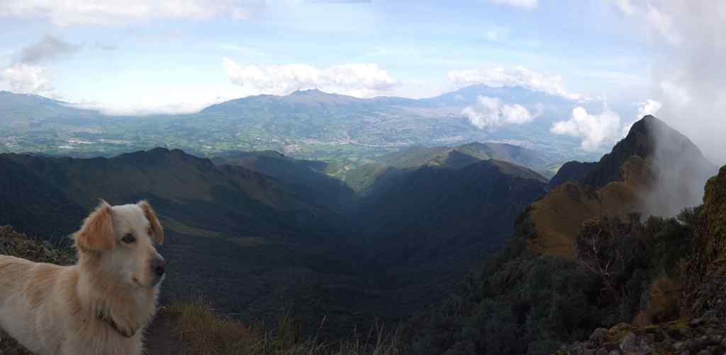Nach einer Stunde wird der Weg flacher und leichter. Aber eine weitere Stunde später geht es dann richtig an den Aufstieg. Die beiden Amerikaner geben auf und kehren um. Zu zweit kämpfen wir uns weiter nach oben und erreichen nach insgesamt drei Stunden den Gipfel des Pasochoas auf 4200 Metern, circa 600 Meter über dem Hostel. Der Hund, der uns vom Hostel gefolgt ist, hat den Punkt, ebenfalls erreicht.
