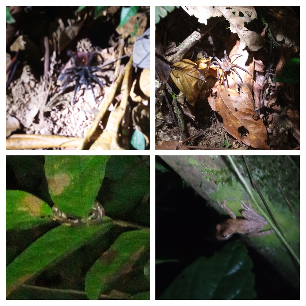 Im Dunkeln geht es dann nochmal in den Wald, um ein paar Nachtlebewesen zu entdecken. Wir finden diverse Spinnen, darunter Wolfsspinne und Tarántula, Frösche, Fledermäuse und eine kleine Schlange. Die Fledermäuse sind übrigens in Masse auch bei Dämmerung über dem Fluss anzutreffen, auf der Jagd nach Insekten.