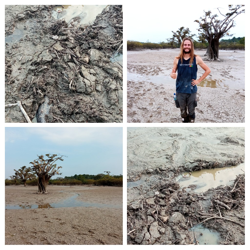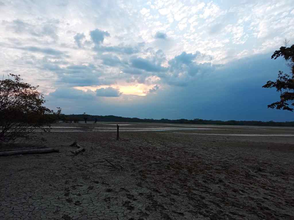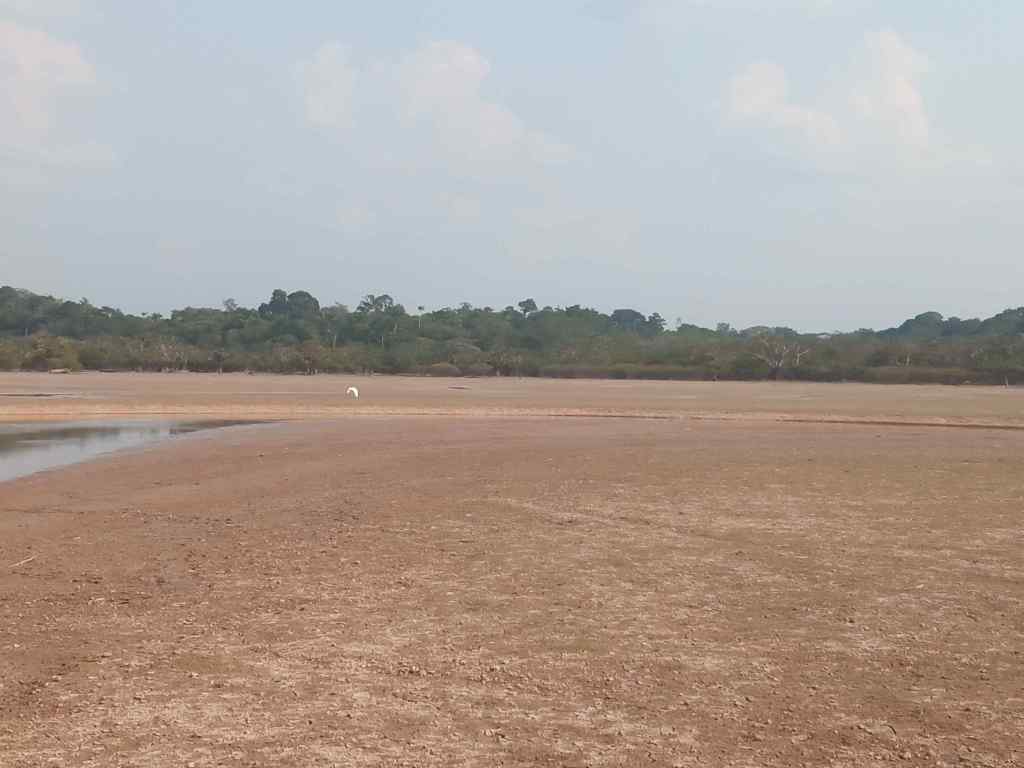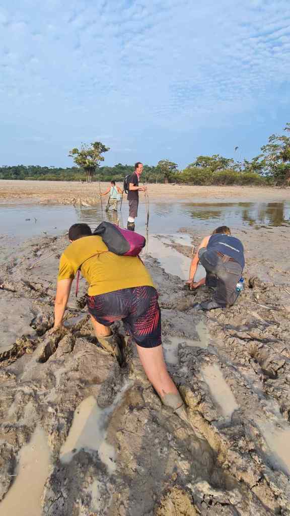 Am späteren Nachmittag geht es mit dem Boot zur großen Lagune, um nach einer Anaconda zu suchen. Wie bereits erwähnt, ist die Lagune ziemlich ausgetrocknet und so geht es zumeist durch Schlamm. Teilweise ist es ein Kampf, die Gummistiefel wieder zu lösen. Einmal verliere ich den Stiefel, weil er sich so fest gesaugt hat. Zum Glück liegt ein Baumstamm in der Nähe, auf den ich mich Knien kann, um dann mit beiden Händen am Stiefel zu ziehen, während der Schlamm langsam hineinsickert. So viel zur Tiefe des „Moores“!