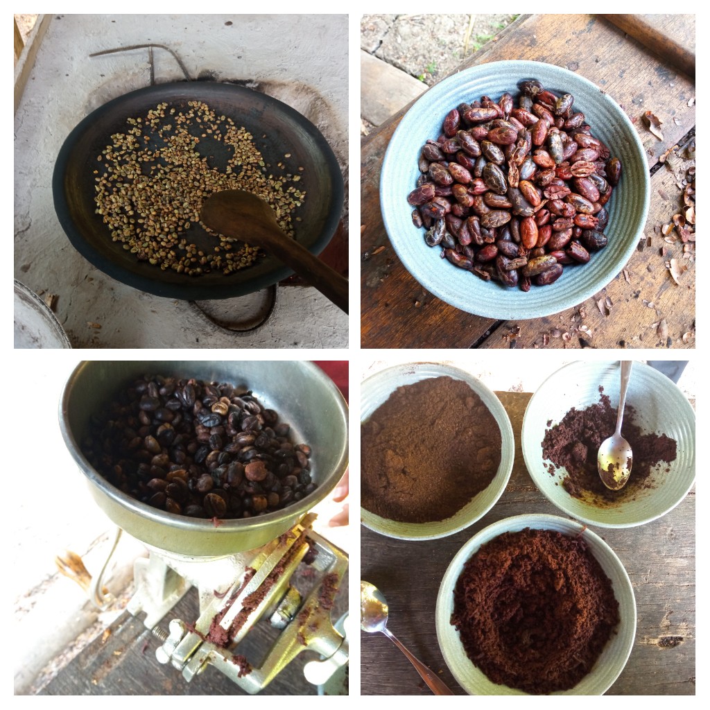 In der Hängematte liegend, schlafe ich direkt wieder ein und muss in mehreren Versuchen geweckt werden, als es mit der Schokoladen- und Kaffeeproduktion weitergeht. Wir rösten und schälen die fermentierten Früchte der beiden Pflanzen und dann werden sie jeweils zu einem Pulver gemahlen. Es ist nicht das erste Mal, dass ich sowas mache, aber es macht trotzdem Spaß.