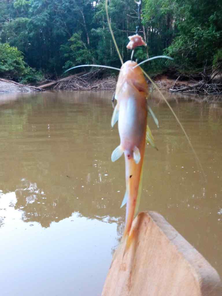 Danach geht es nochmal auf den Fluss. Wir wollen Piranhas angeln, um sie dann wieder in den Fluss zu werfen, da dies hier für Touristen eigentlich nicht erlaubt ist. Zweimal packen wir die Angeln schnell weg, weil sich ein anderes Boot nähert. Tatsächlich fangen wir keinen Piranha, was dem Guide wohl noch nie passiert ist, aber zumindest zwei kleine Cat-Fische, die wir auch mitnehmen, da es diese hier zu Dutzenden gibt und die es zum Abendessen dazu gibt.