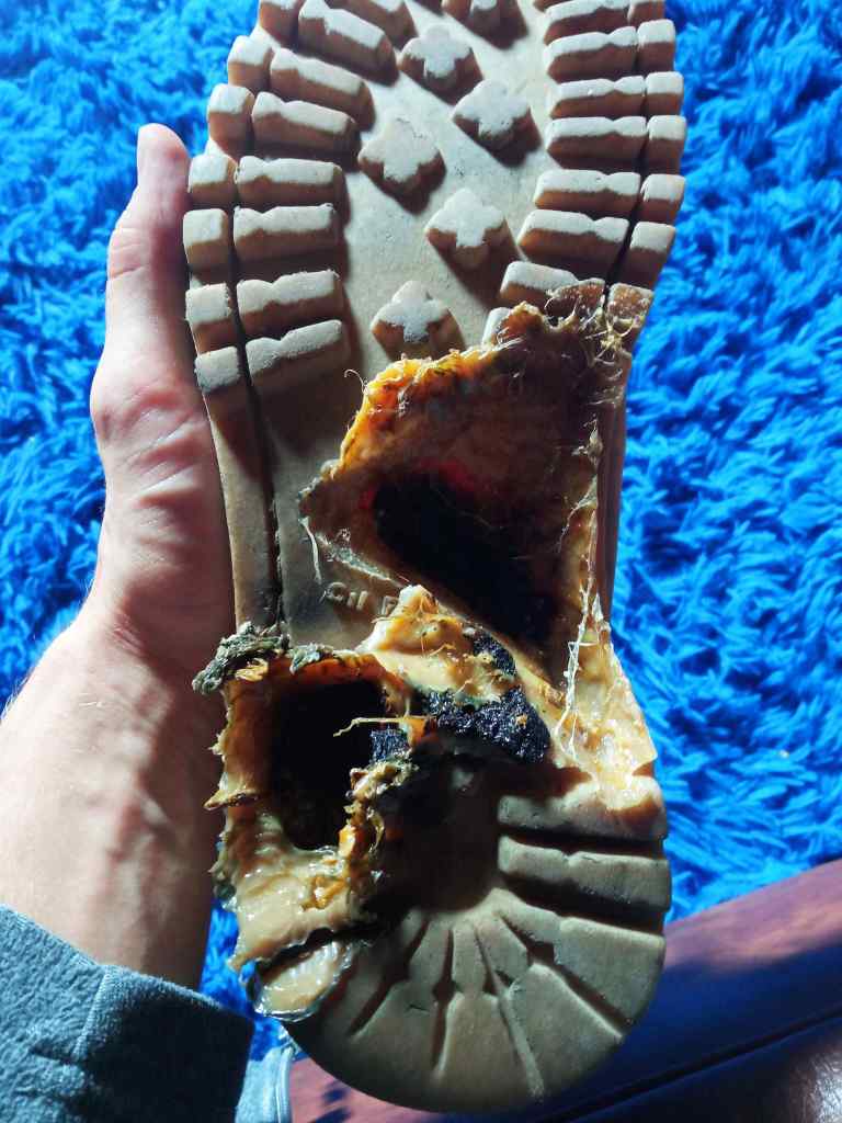 Es ist eine Kunst, sich mit dem gesamten Gepäck hinten auf dem Gefährt zu halten, vor allem, da es keine ordentlichen Fußabstellflächen bietet bzw. die Eisenstange, die ich dafür halte, so heiß wird, dass sie meine Schuhe schmilzt. Ich bemerke die Hitze, bevor sie meinen Fuß erreicht, aber an zwei Stellen ist die Sohle durch und nun mit der Einlegesohle verschmolzen. Laufen geht in den Schuhen aber noch erstaunlich gut.